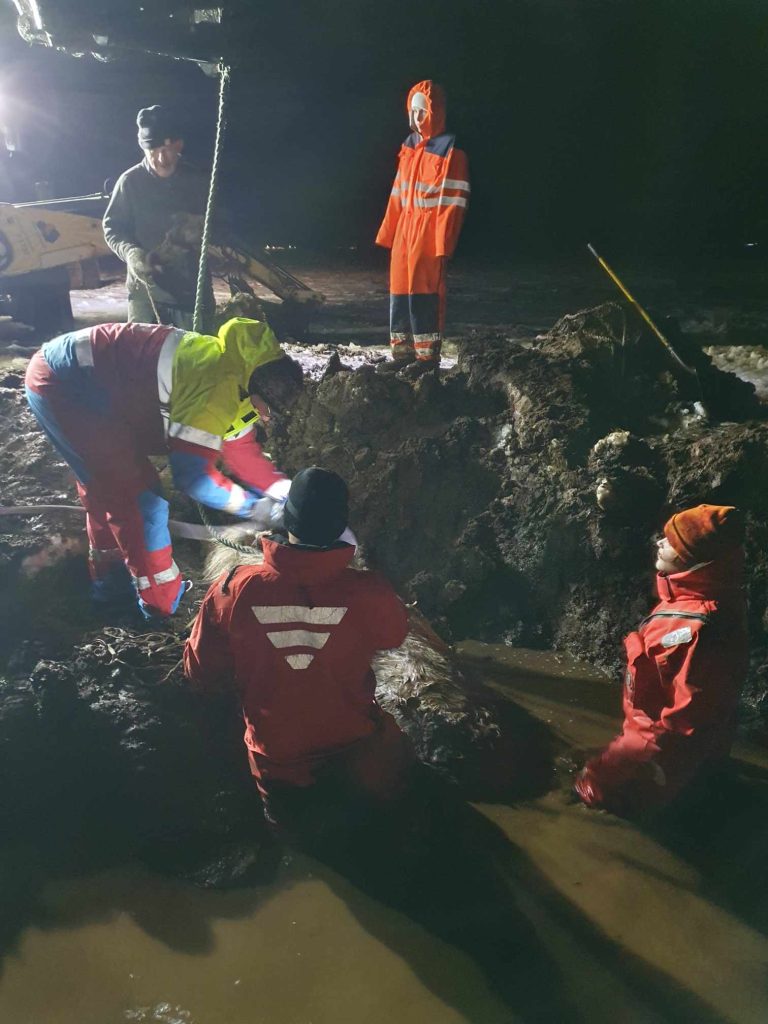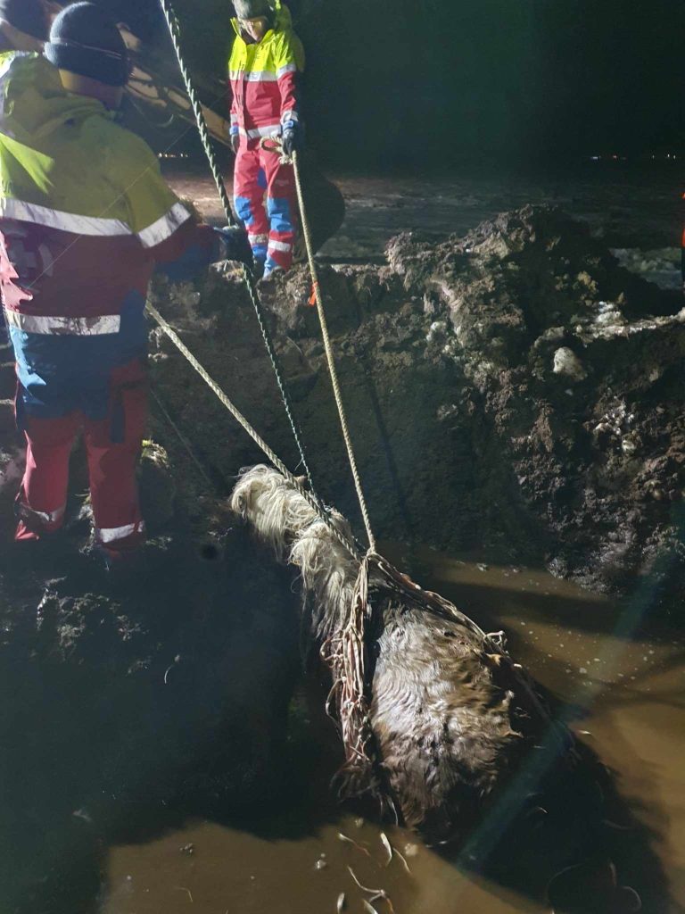 Un voisin équipé d'un chariot télescopique est venu en aide et un tracteur-pelle a également été impliqué. Le filet de sauvetage utilisé a fréquemment été utilisé pour sauver les chevaux et le bétail des fossés et des fosses à lisier.